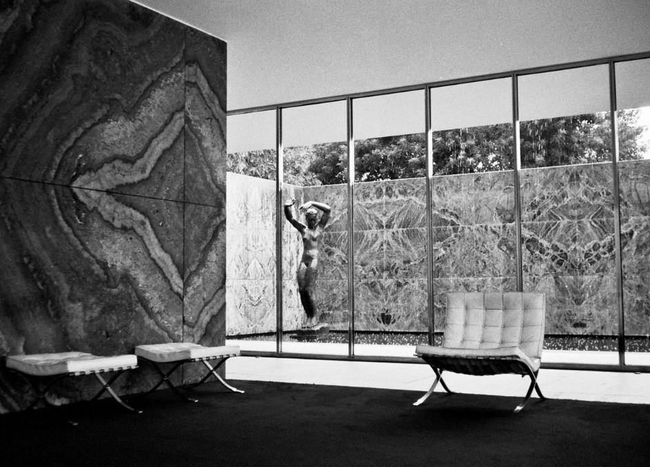 Ông đã tạo ra một không gian linh hoạt chảy trôi mượt mà giữa các phiến đá thượng hạng, kết cấu khung thép tối tân, tường kính trong suốt và mặt nước rộng mở: một nhà triển lãm thể hiện trọn vẹn tinh thần dân chủ, tiến bộ và thịnh vượng của nước Đức thời bấy giờ.