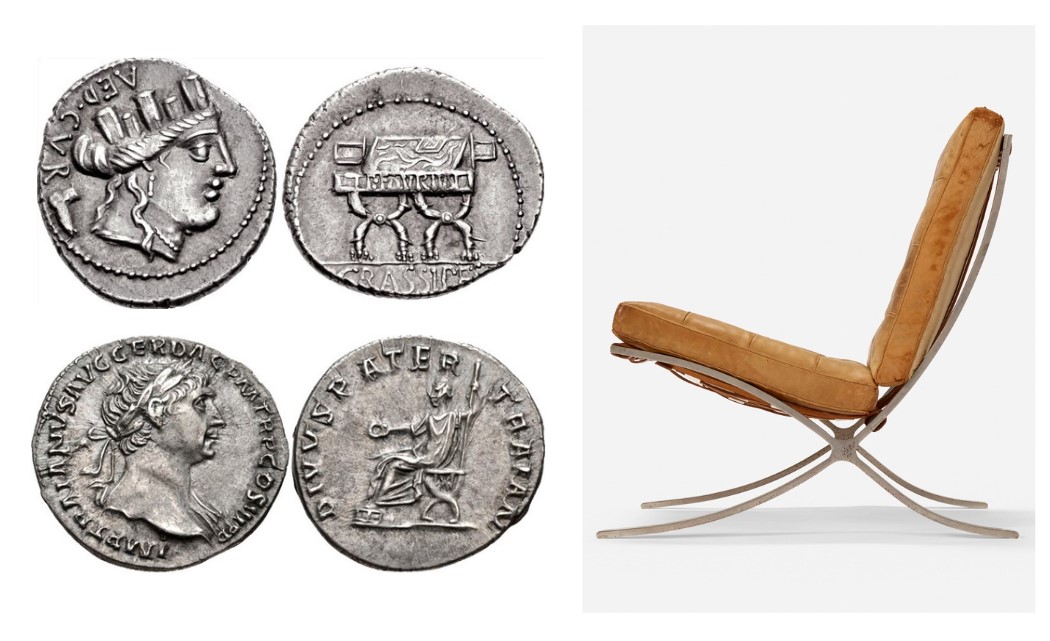 Hình ảnh ghế Curule trên tiền xu đúc tại Rome gắn liền với hình ảnh của những người cai trị. (nguồn ảnh wikipedia và wright20)Mies đã tái sinh biểu tượng quyền lực hàng ngàn năm tuổi bằng cách sử dụng khung thép thay thế cho gỗ rắn truyền thống. Phần đệm ghế và phần dây đai làm từ da lợn, được cắt và khâu tay tỉ mỉ. Các đường cong thanh mảnh kết hợp cùng các mặt phẳng căng mịn, tạo nên một ngôn ngữ hình học trong sáng và tối giản. Sự kết hợp kim loại cứng, lạnh với da mềm, ấm, giữa đường cong và mặt phẳng đã tạo nên đối thoại tinh tế giữa lý tính và cảm xúc, đồng thời phản ánh sự giao thoa của công nghệ máy móc và thủ công truyền thống trong thời đại mới.